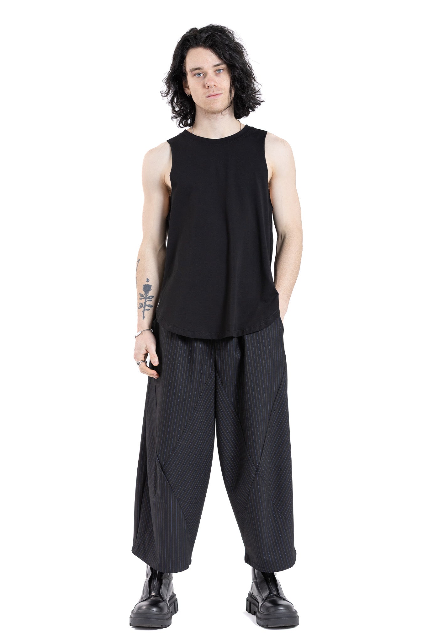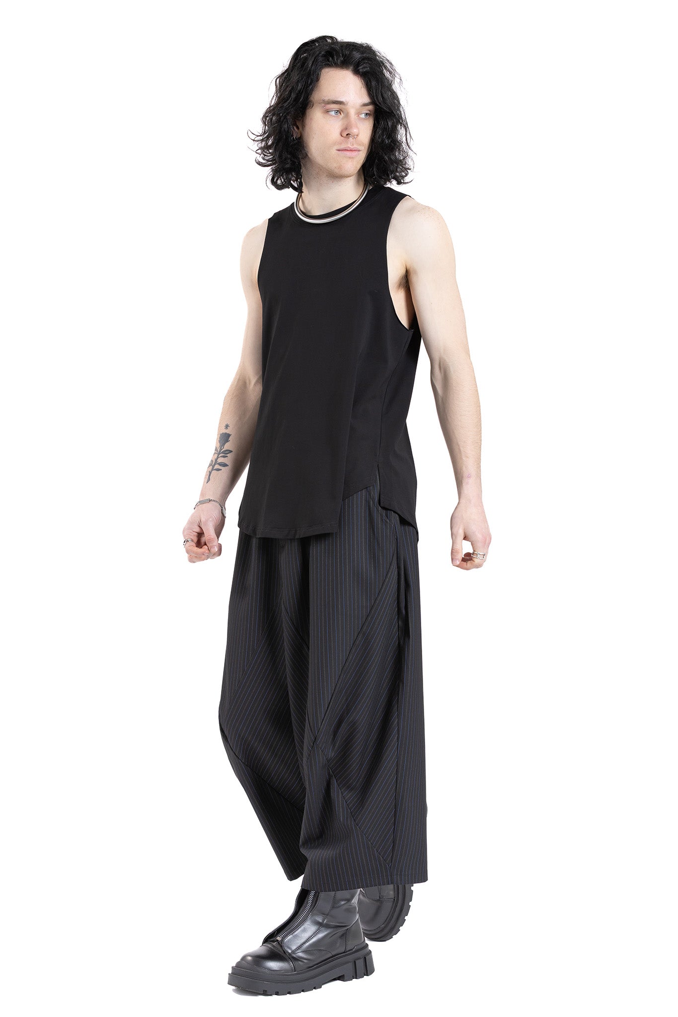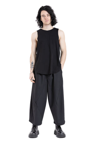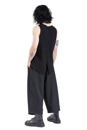Crew neck tank Top with scoop hem line and a peek-a-boo cross-over back. Low cut armholes with a raw finish.