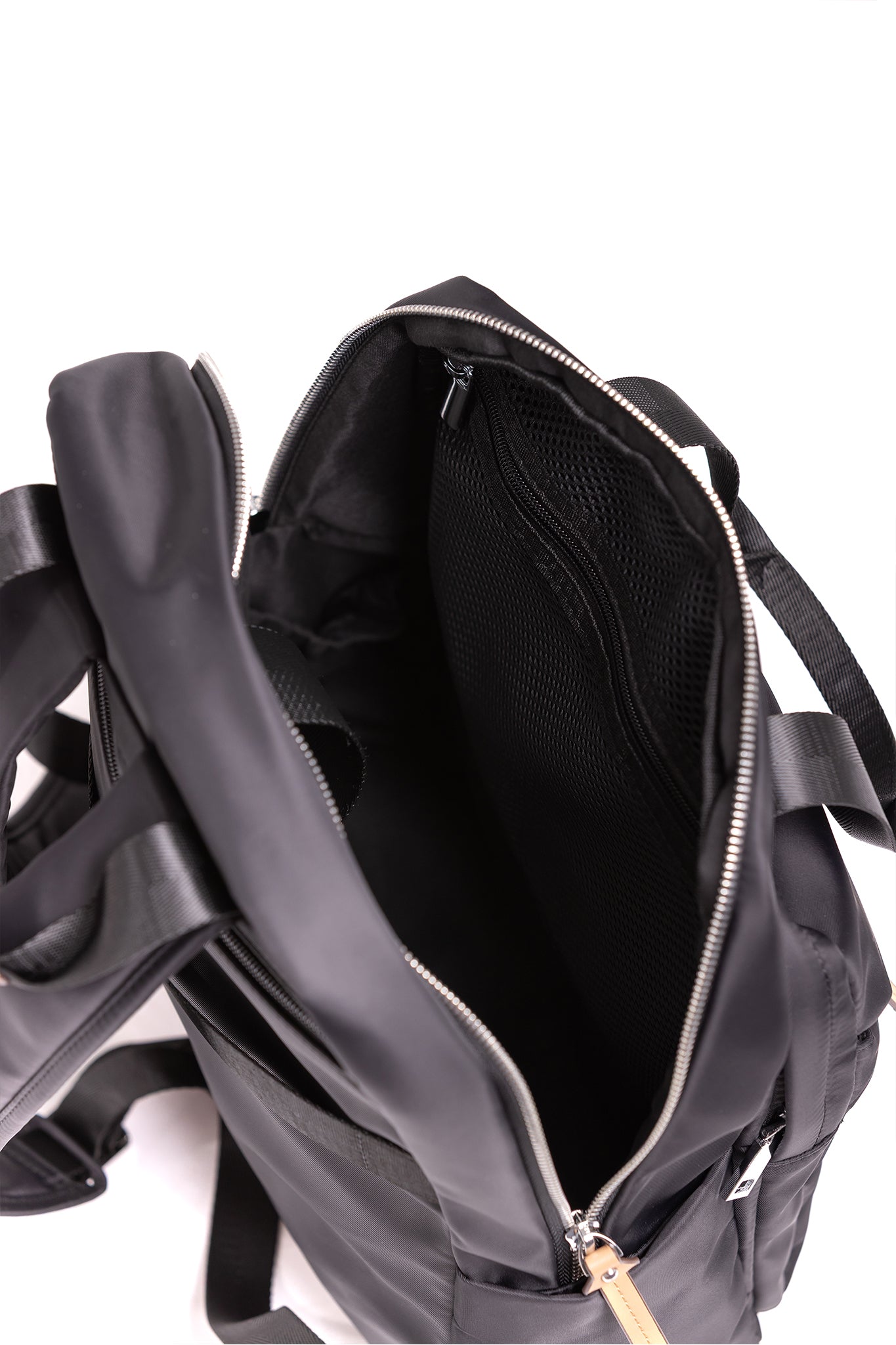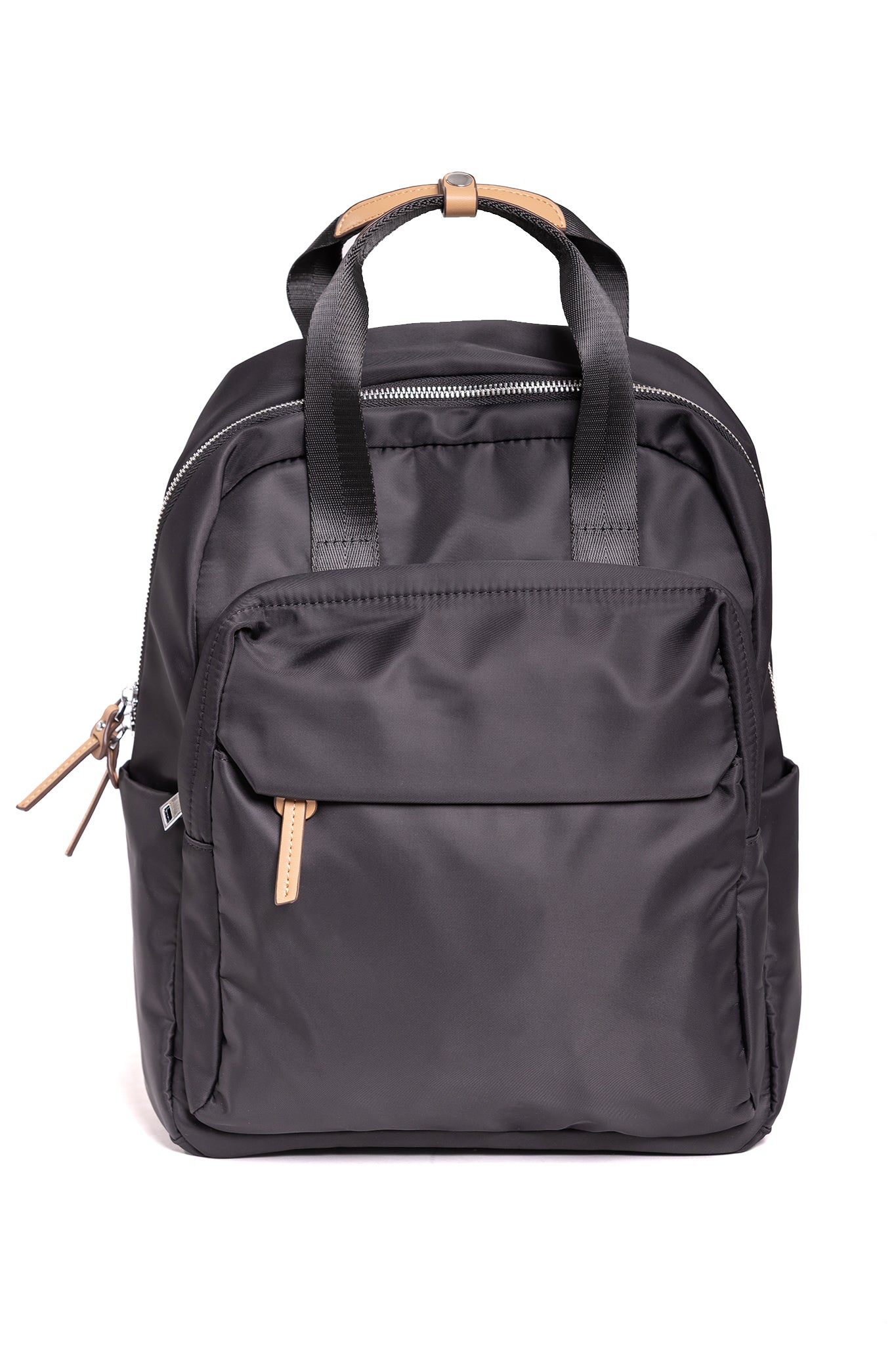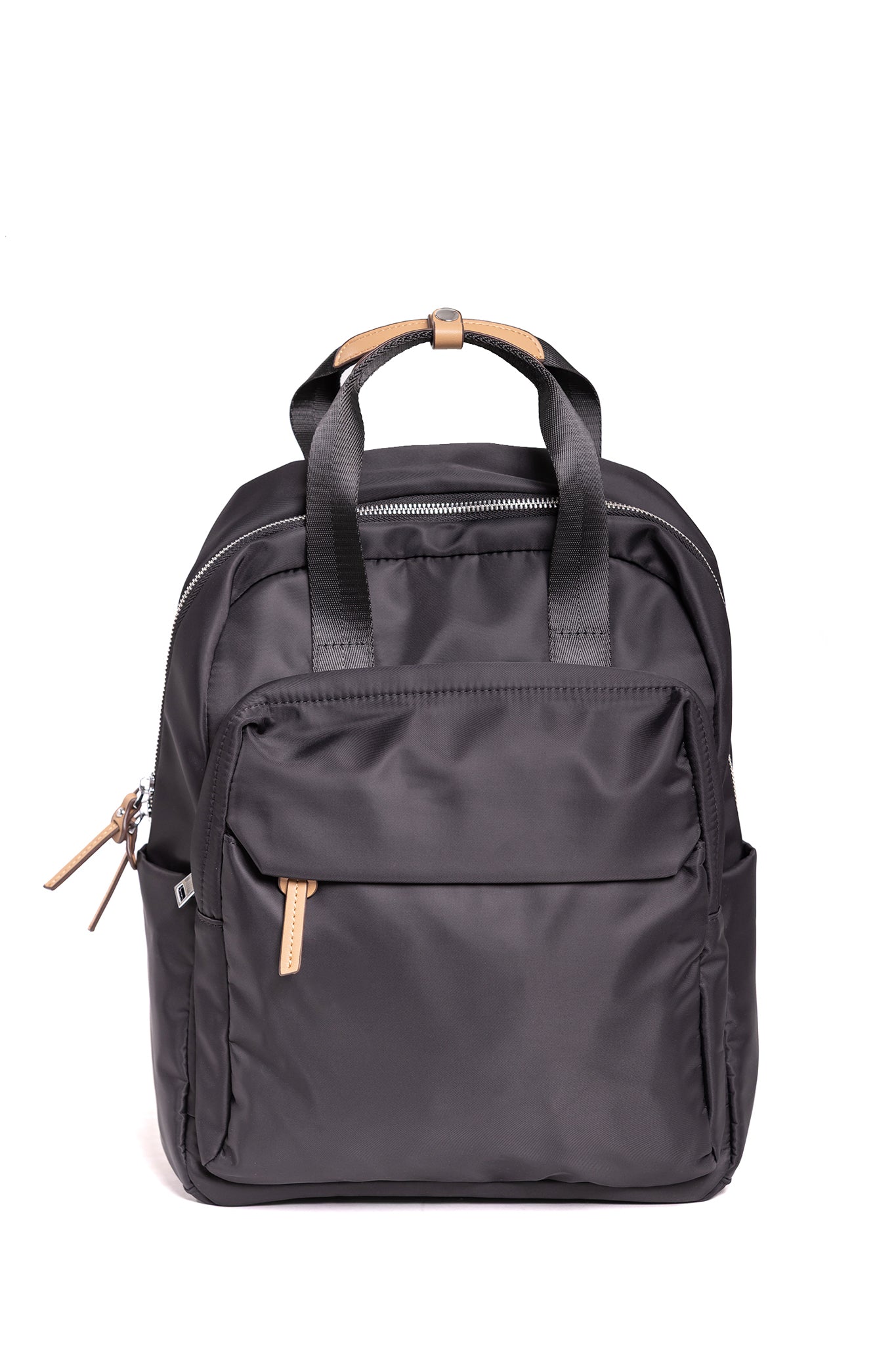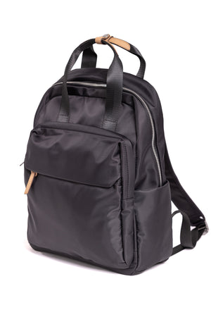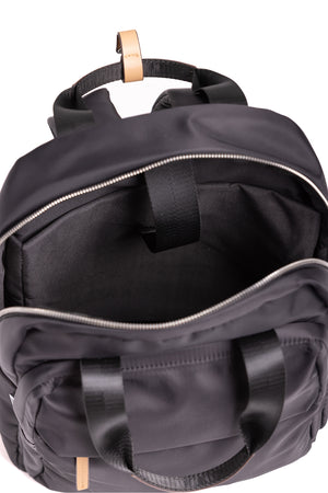 Nylon Backpack with feature genuine leather natural detailing.