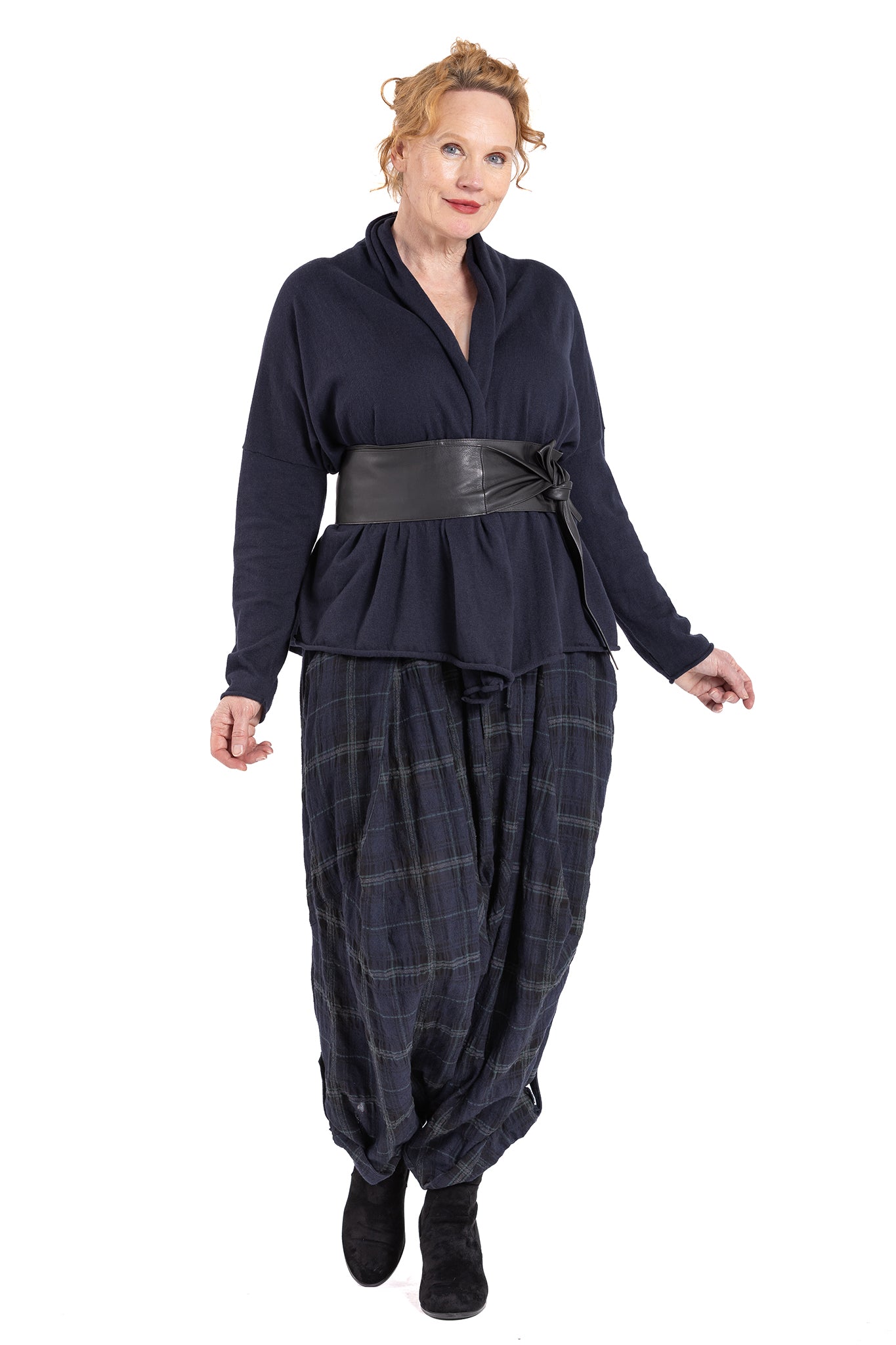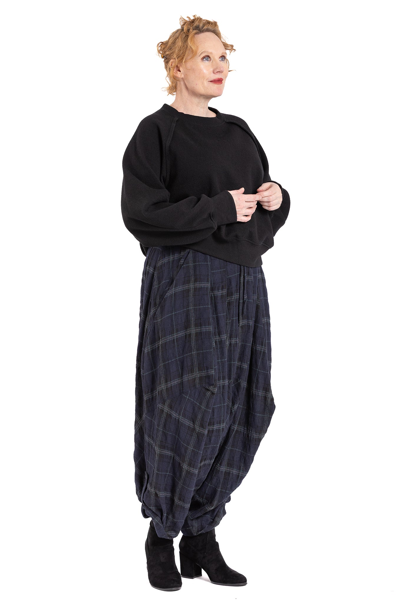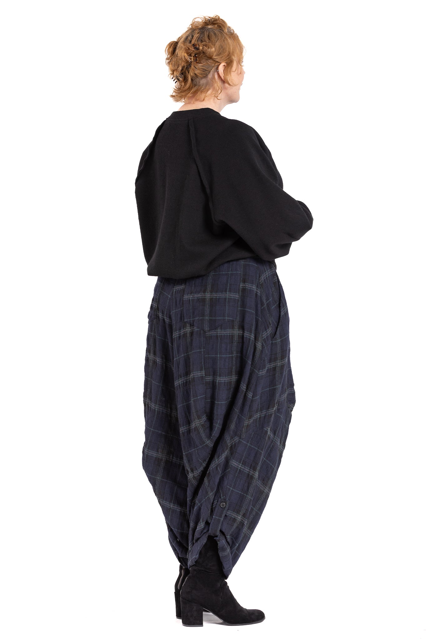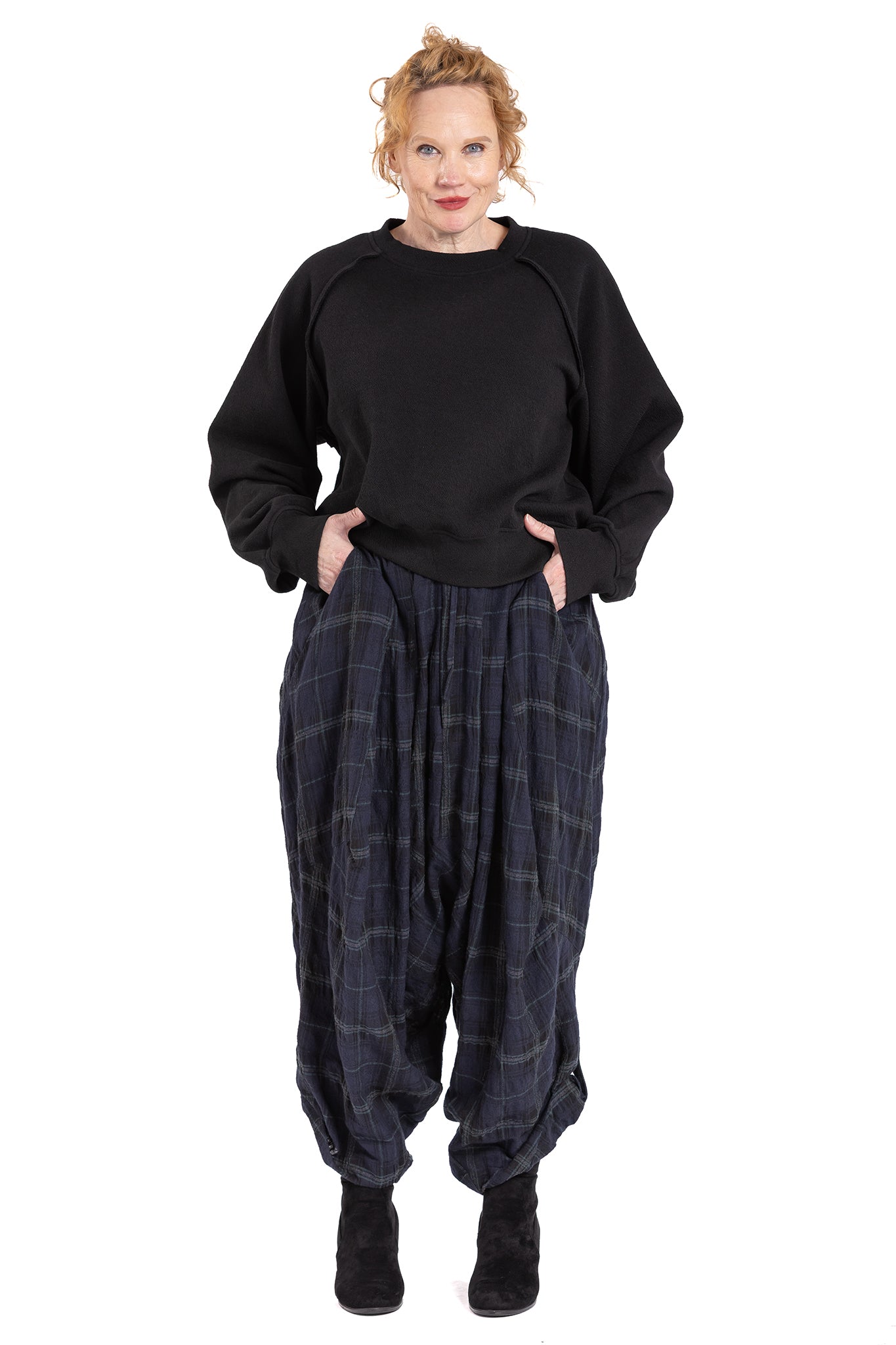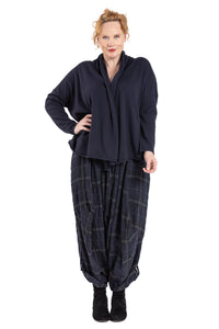 Asymmetric drape Pants with fly-front and 2 button closure at centre front with additional drawstring waistband to pull in at waist. Insert side pockets and back patch pockets.