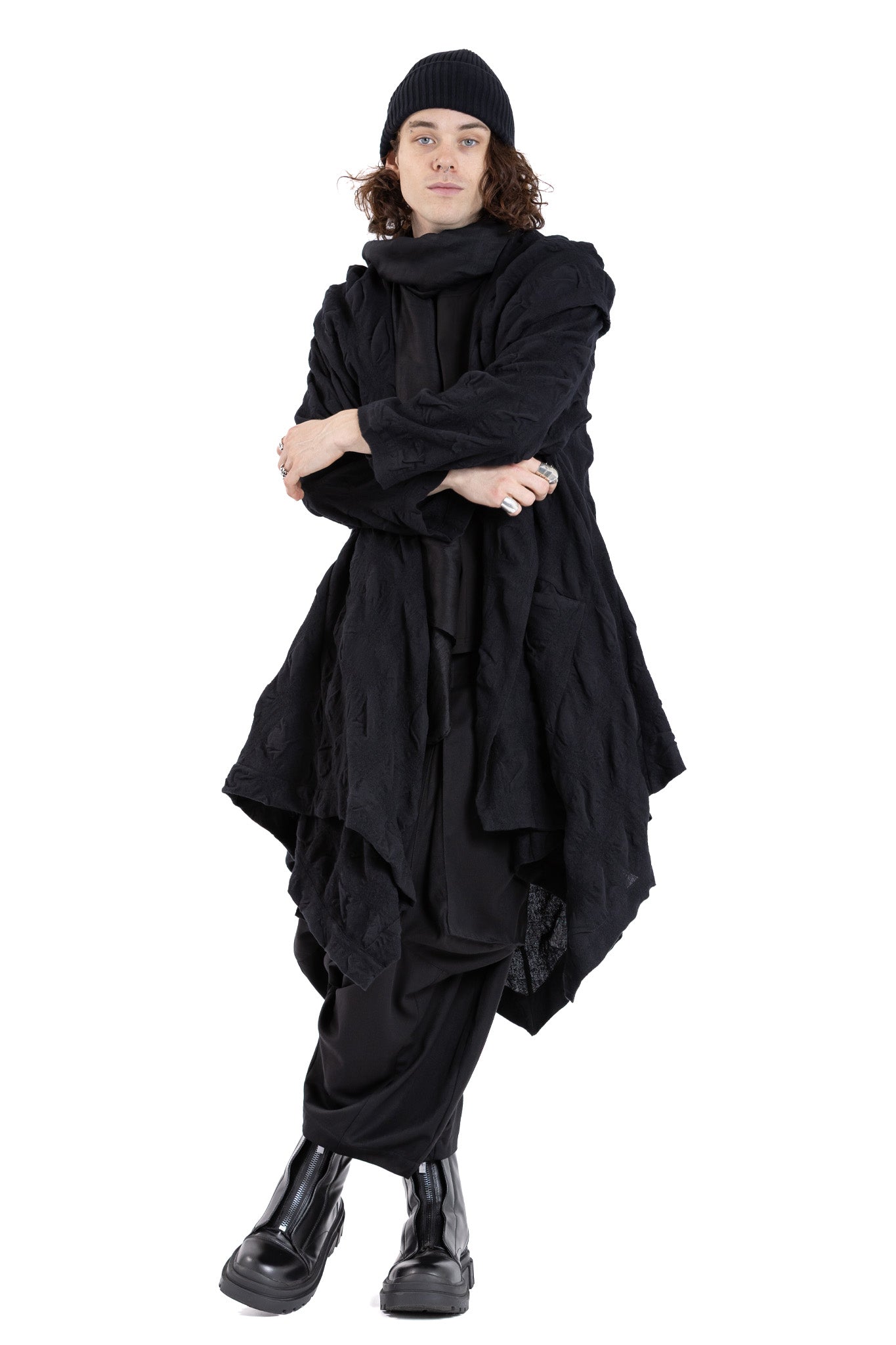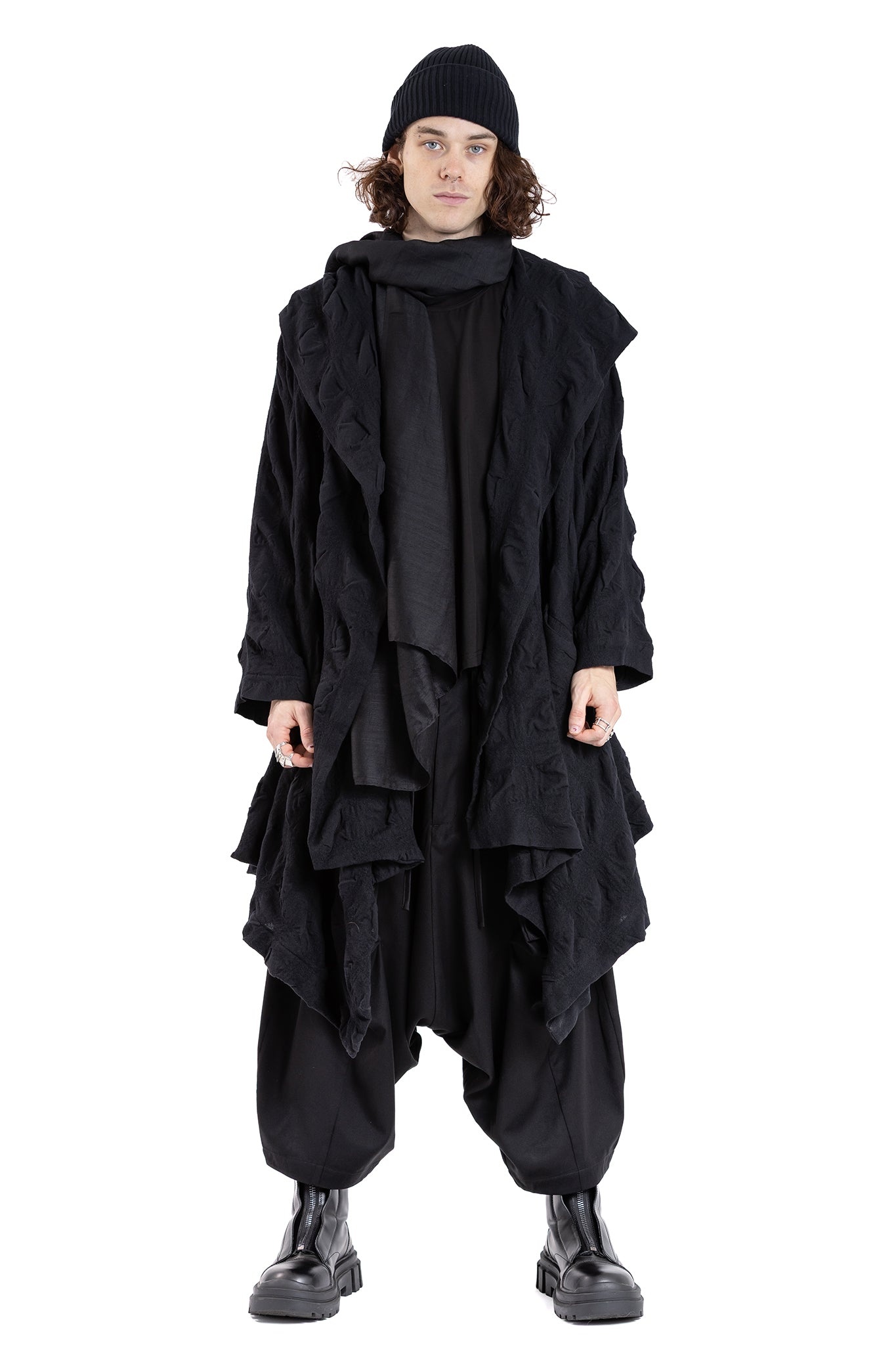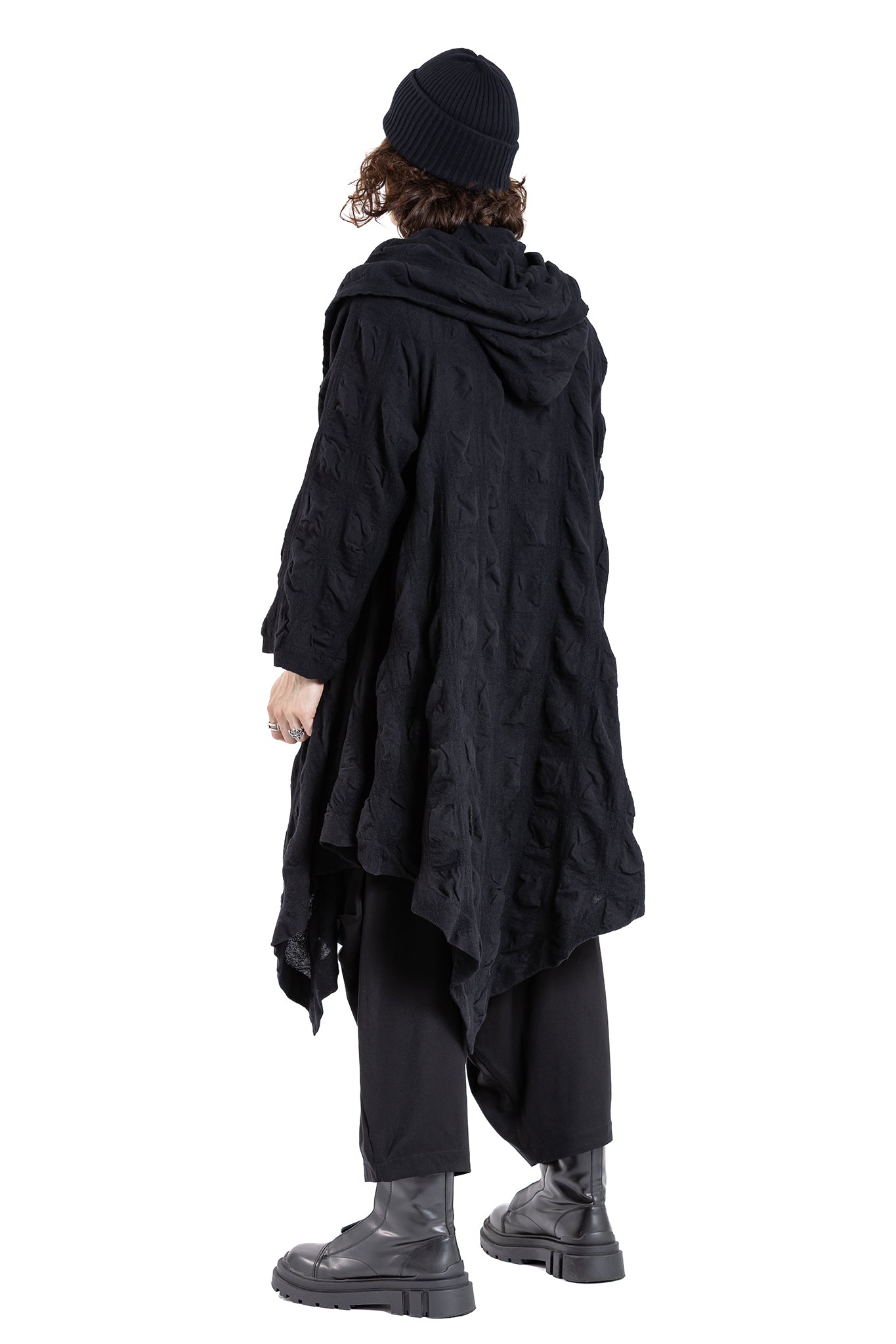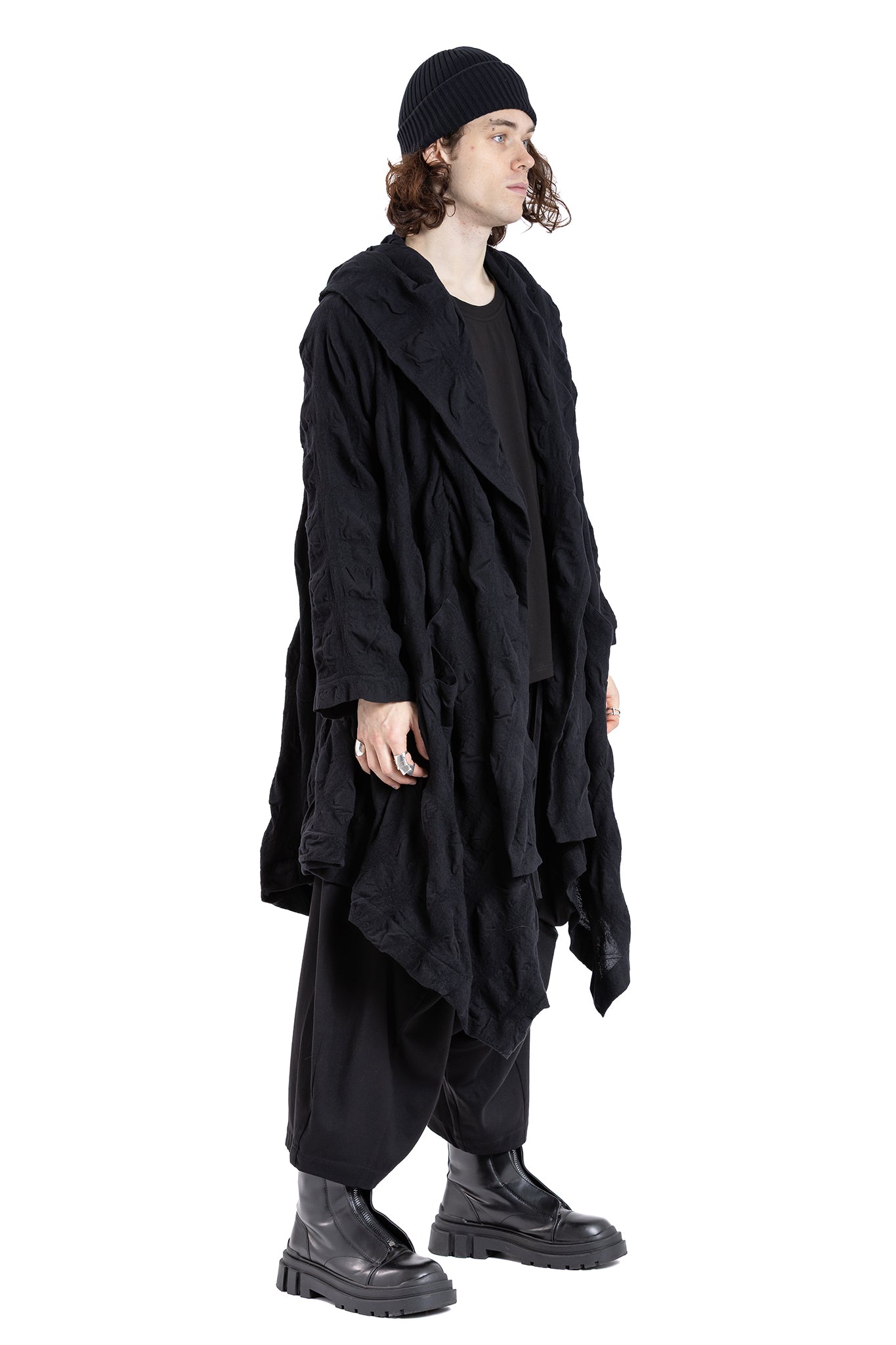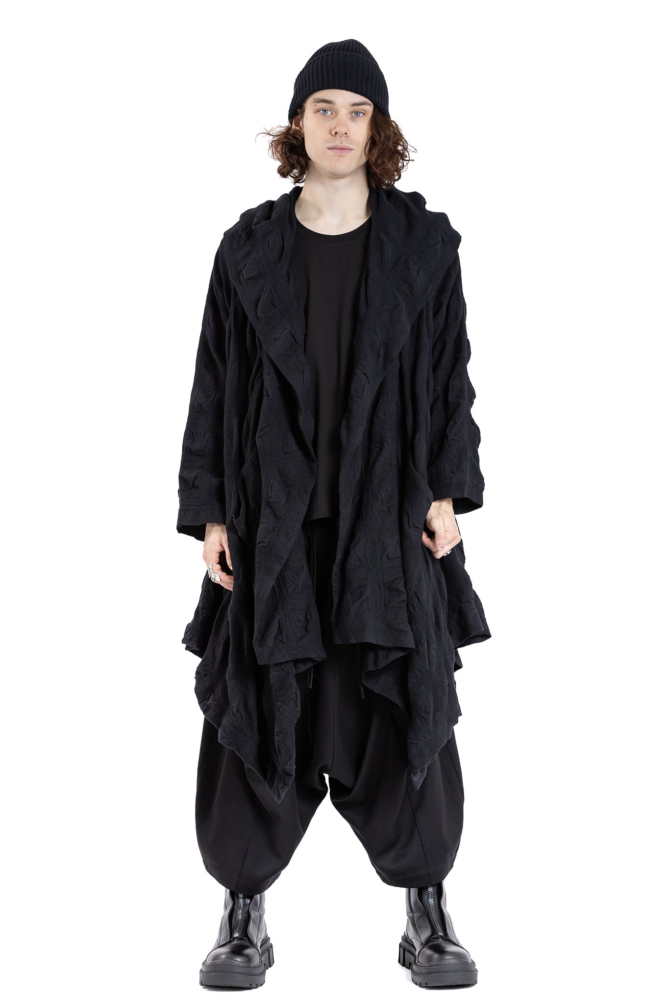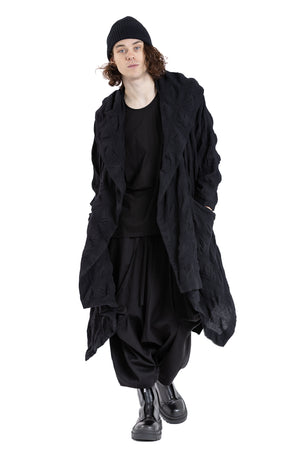 Loose-fitting oversized Coat with dramatic hooded drape-collar with insert pockets.